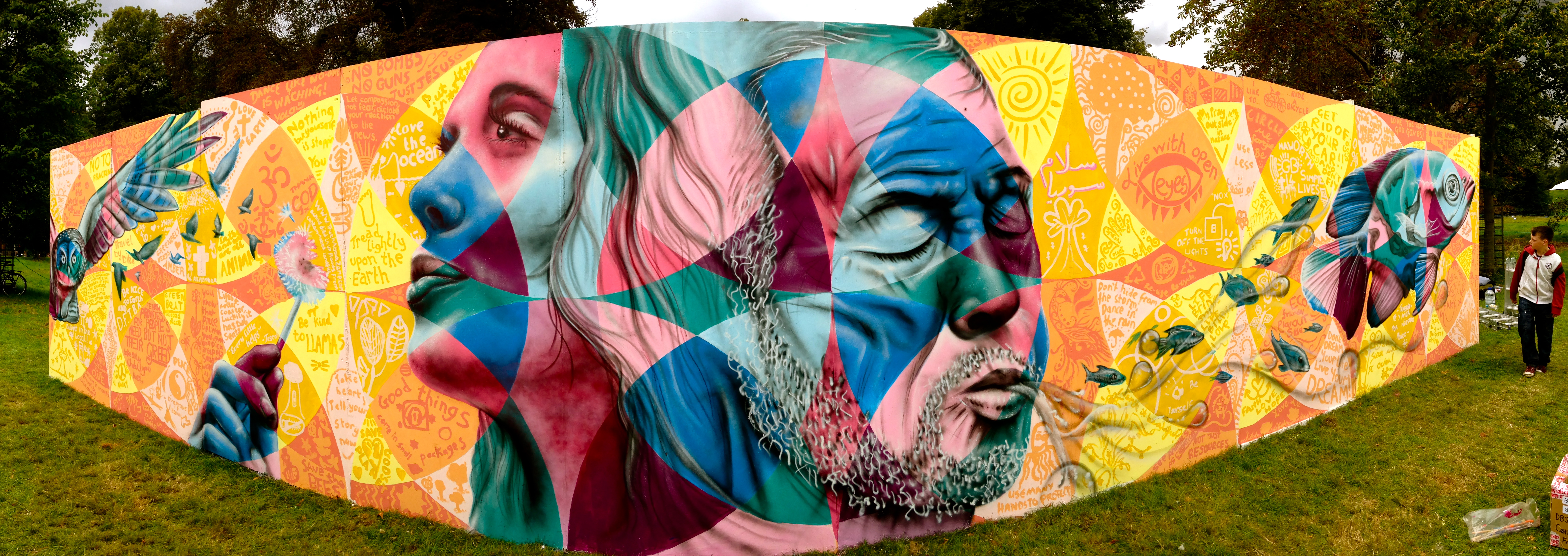 In August, I spent 4 days at the Greenbelt Festival outside of London, which focuses on progressive social causes, music and art. I worked with a group of volunteers to create an interactive mural on a long wall in the entrance of the event, and we welcomed festival- goers to participate in the creation of the piece by adding their poems, drawings and messages on the colored geometric shapes. The theme was the environment; participants were asked to reflect on what we— as individuals and as communities— can do to begin the healing process and reverse the damage done to our natural environment. The wall quickly got filled up as enthusiastic people of all ages and from a variety of countries and ethnicities got inspired to add their voice to the wall. Everyone seemed passionate about at least one aspect of this issue, whether it be the pollution of our water and air, the dramatic effects of climate change, the shocking rate of animal species becoming extinct, the cutting down of rain forests or many others. It was amazing to see small children painting with their parents and elderly people participating alongside teenagers, everyone excited to be part of the creation process of a giant work of art. Thanks to all the volunteers, participants and the organizers of Greenbelt for welcoming me and supporting the mural project!