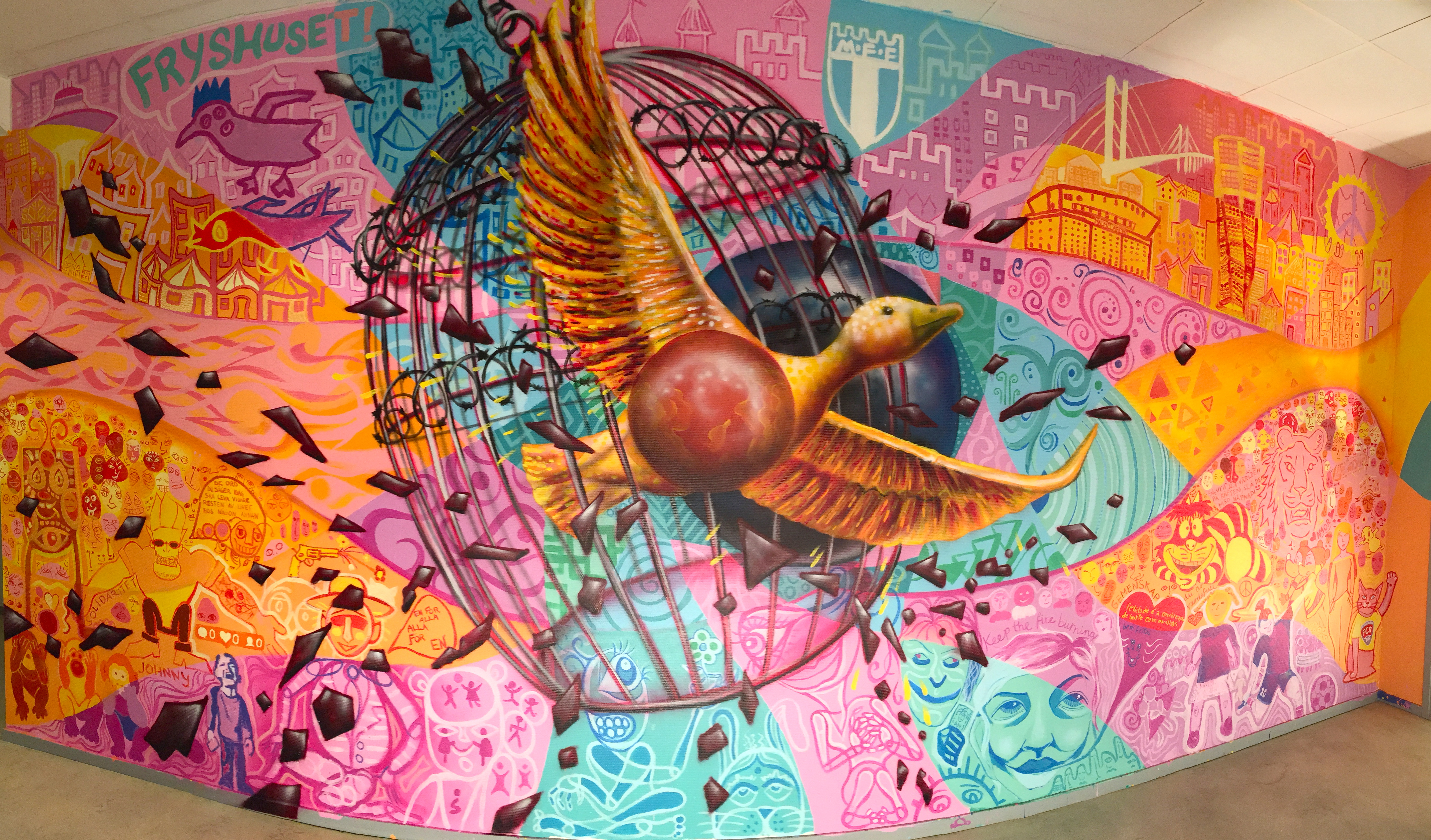 The central image of the mural was a bird breaking free from a cage, which the young people felt expressed their desire for freedom and a breakdown of traditional boundaries and borders, both physical and mental. The rest of the mural was made up of the reflections of the participants on this subject, as well as imagery that they felt represented them and their communities.