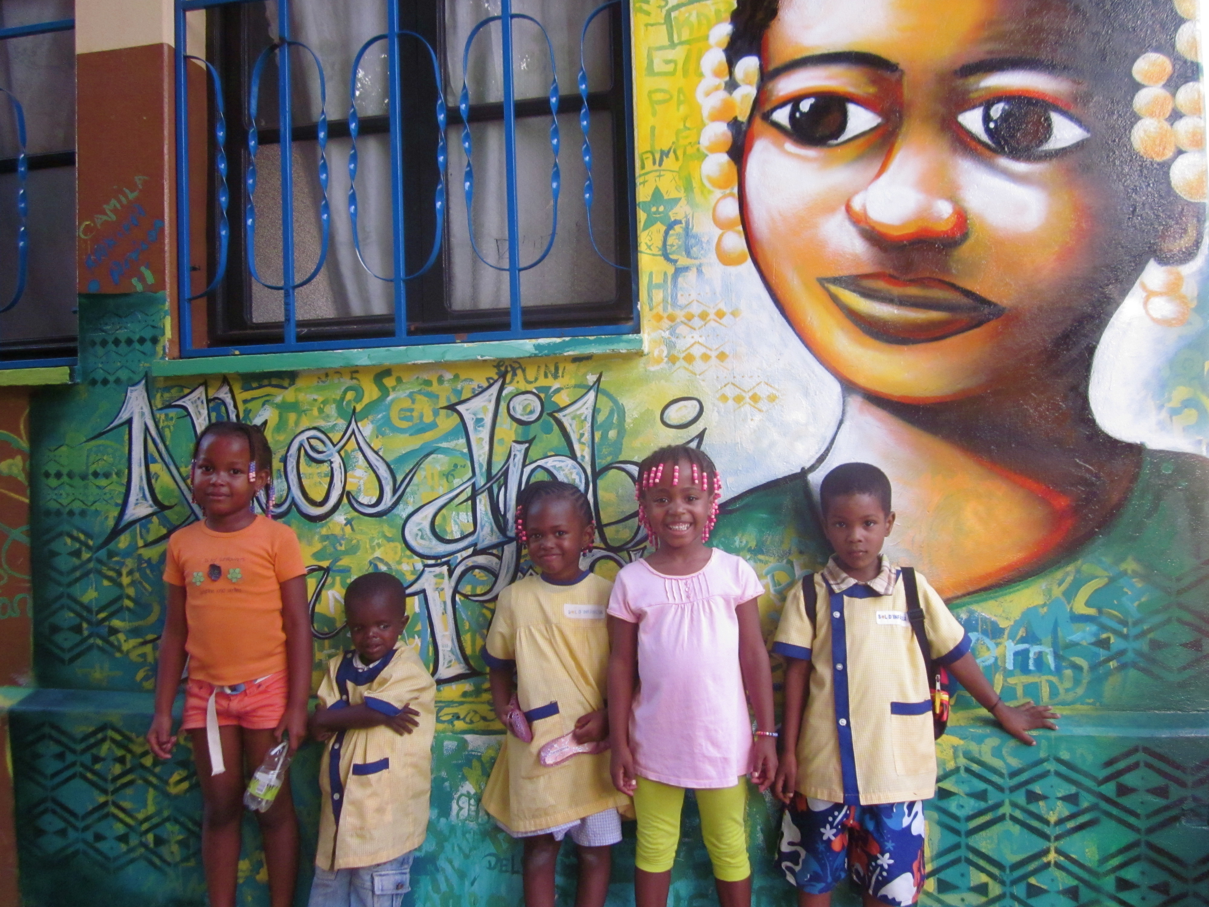 Kids in Mindelo, on the island of São Vicente, come to help out on the mural.