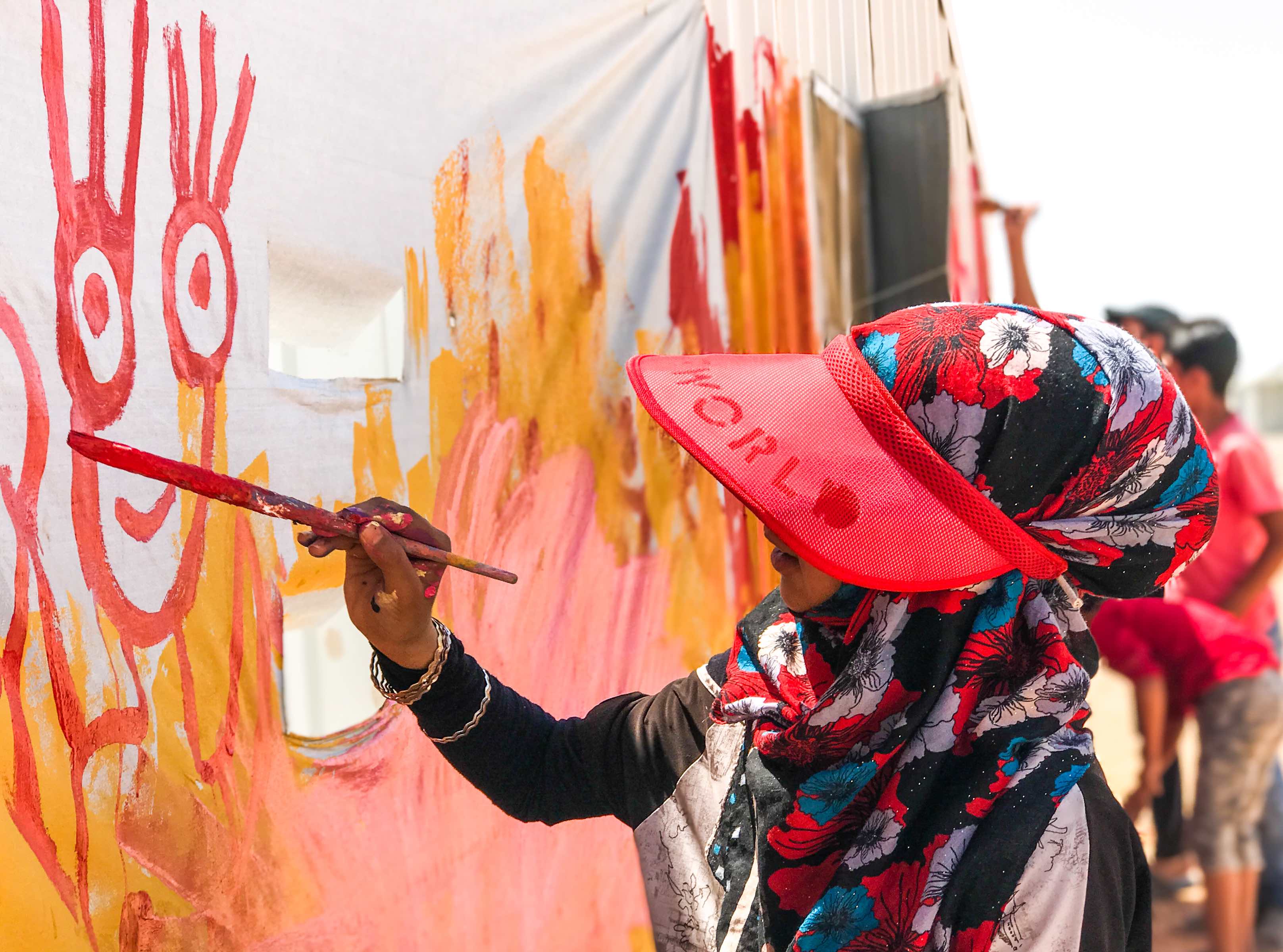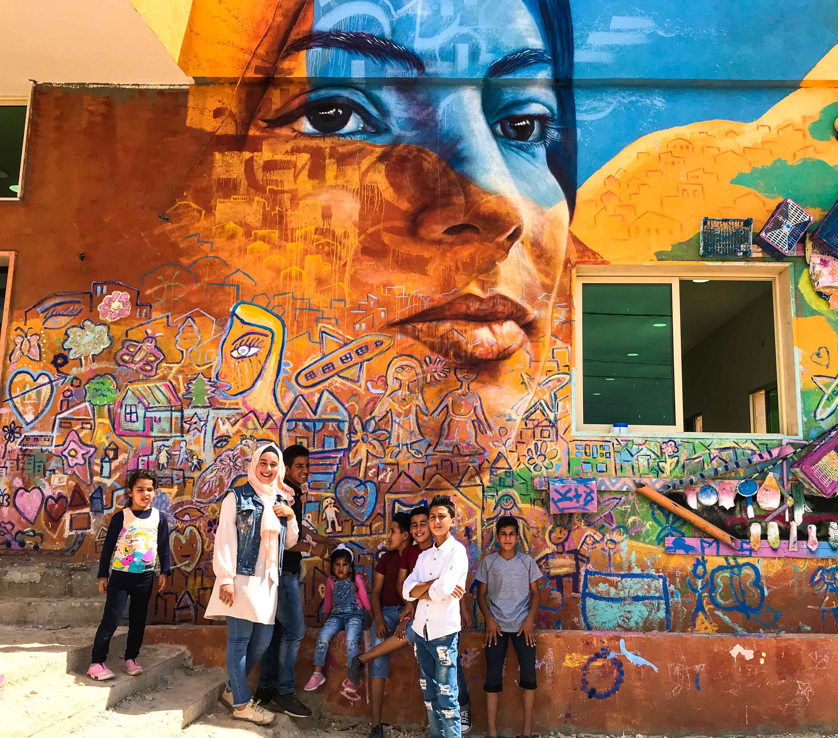 Back in 2013, when the Syrian War was still new and refugees were pouring across the desert border of Jordan, I found myself in the sprawling, chaotic Za’atari Refugee Camp, paint brushes in hand. I had never been in a refugee camp, never been to the Arab world, so I was a bit nervous and not sure how the community would receive mural projects for kids– would it matter? But if there was ever a place that needed color, joy and art, it was this desolate, colorless desert where people were stuck, many still in shock from their recent trauma and displacement. It ended up being a transformational moment for me, as I experienced the creativity and enthusiasm of so many beautiful children who had been through things that no child should have to go through. I also worked with talented, passionate local artists who wanted a chance to run their own art projects and uplift their community– and a dream was born.