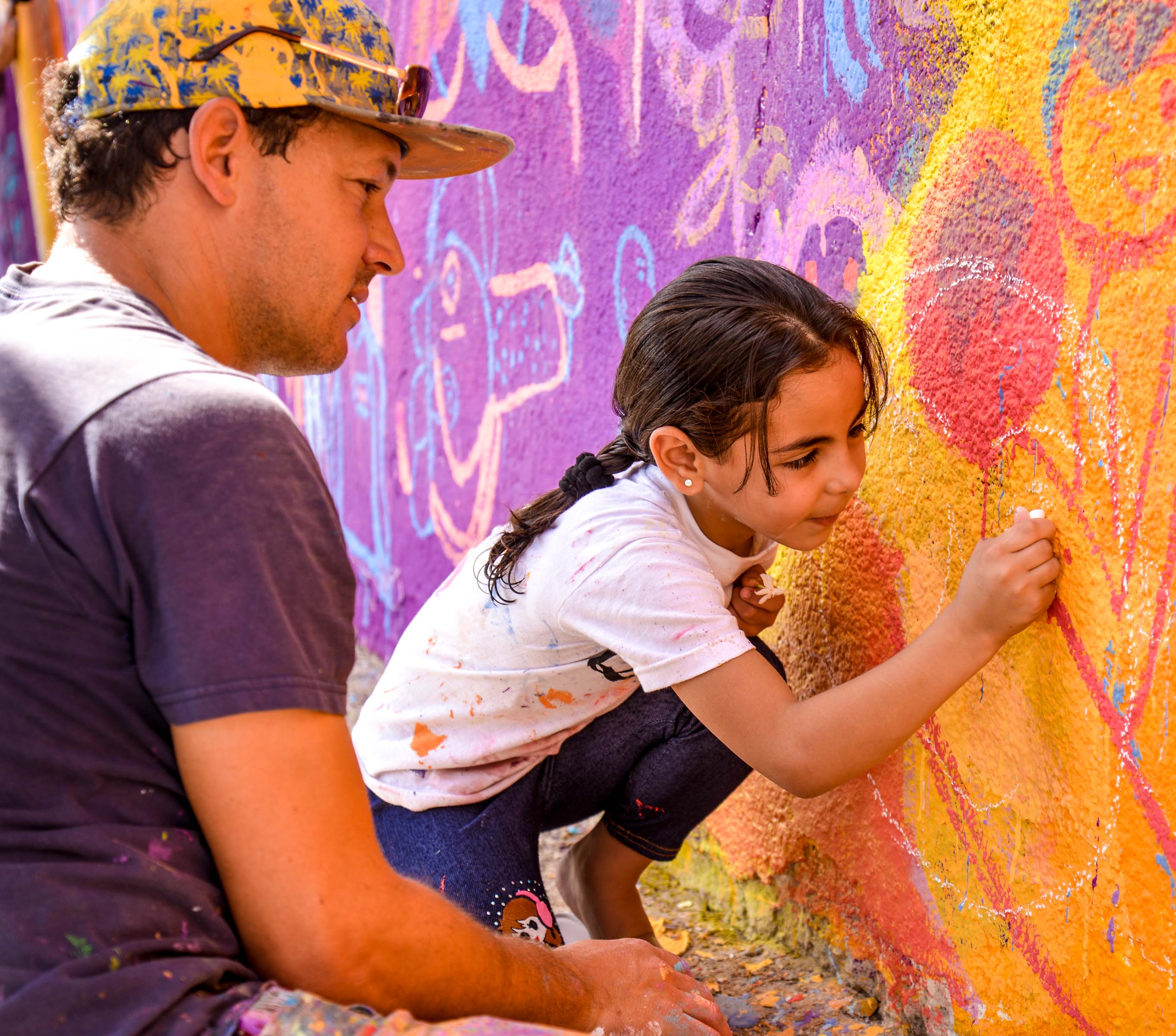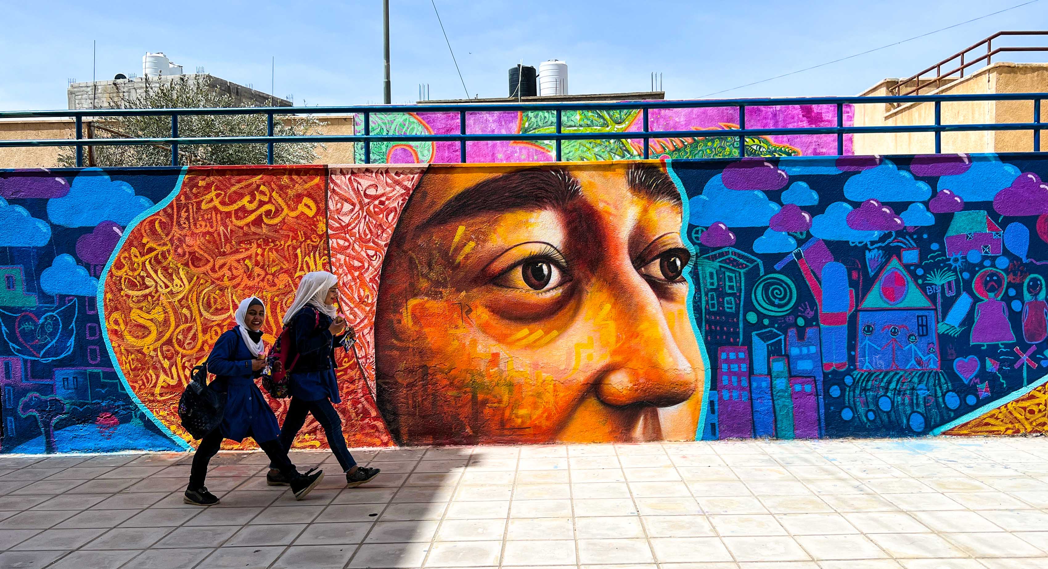 Now, all these years later, I’ve had the good fortune to spend time in Jordan on 8 separate visits, in addition to multiple locations across Lebanon, Palestine and Qatar. As I led mural projects, my wife, CJ Thomas, has led inspiring dance and theater projects, while our small daughters have danced and painted with the “big kids.” The dream of setting up ongoing, sustainable community art programming– led by local artists– has come true: through Artolution and our partners like UNICEF, a team of Syrian refugee artists– half men, half women– has been facilitating murals with kids year-round in the Azraq Camp since 2019. Our Amman-based artist team leads a variety of mural and performance projects across the country, with a smaller program launched in Beirut.