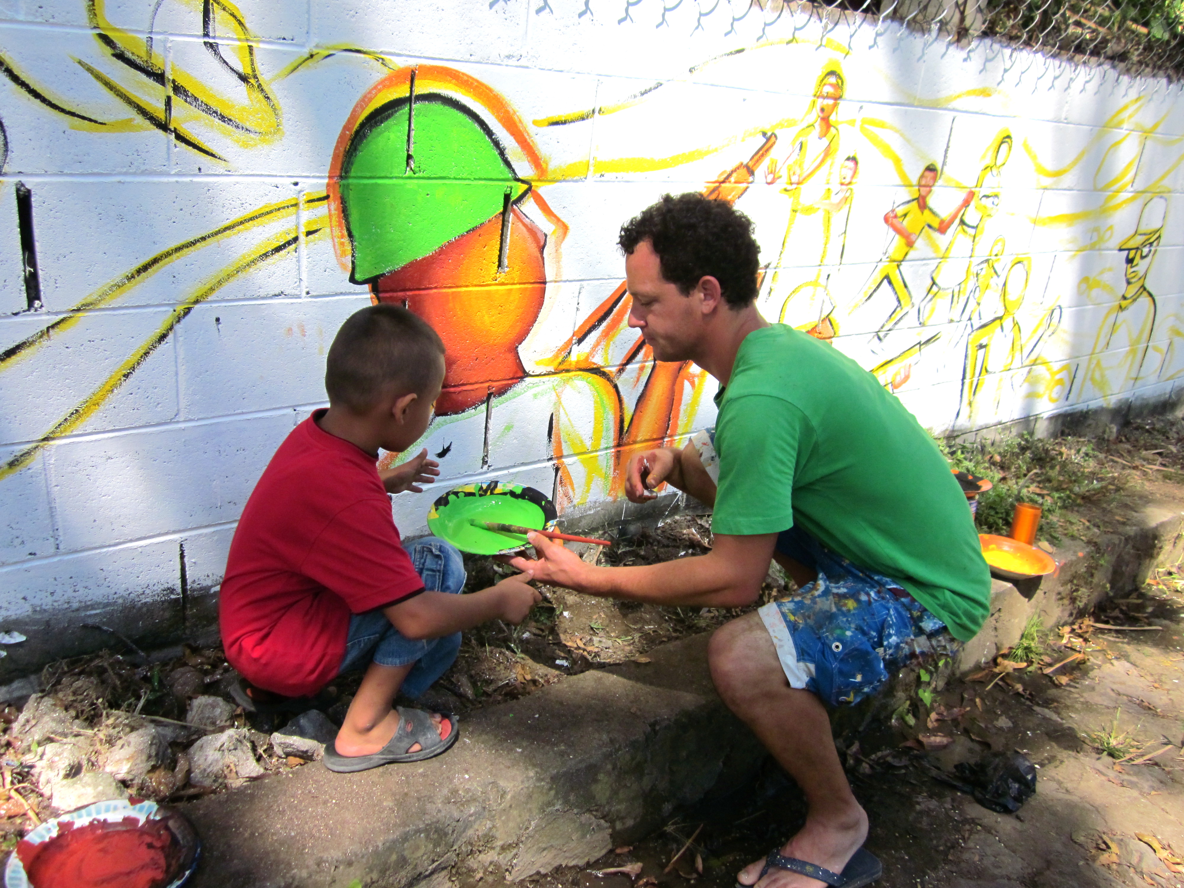 I’ve visited El Salvador multiple times since 2004, and my favorite place is a remote, rural village known as San Antonio los Ranchos in the Chalatenango department, home to my close friends, the Murcia family. Through our historical mural and theatrical performance in 2010, local children and their families explored their past, in which they were bombed and massacred by the military and forced to flee to a desperate refugee camp in Honduras, but then valiantly returned to rebuild their community while the brutal civil war raged on. They dreamed of a future of peace and stability through their revolutionary artwork.
