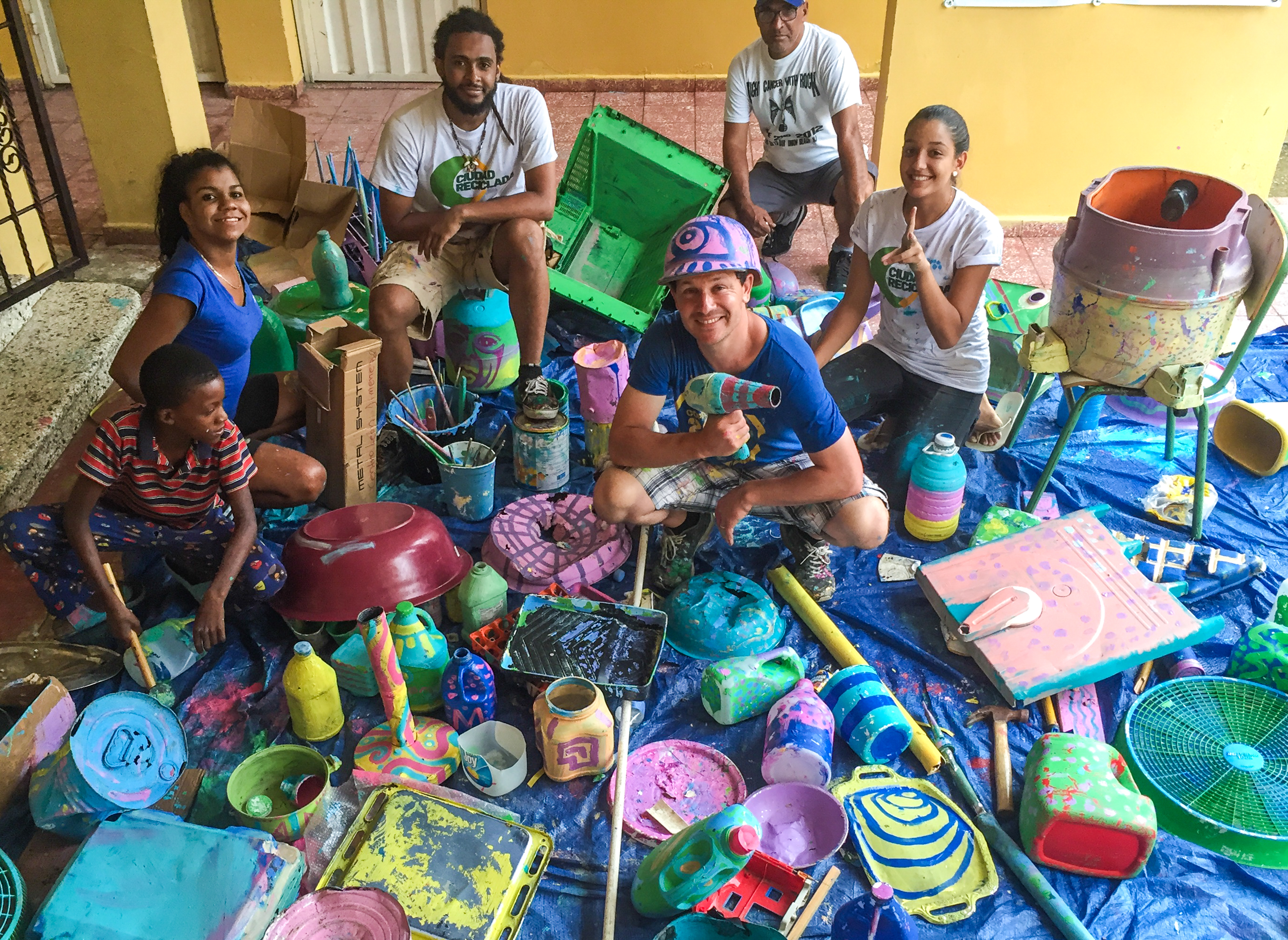 Teenagers in the Rafey barrio in Santiago live near a massive garbage dump, so what better way to repurpose the trash than to create a sculpture-mural that doubles as a percussive instrument? 2017’s “Boatstrument (Barcostrumento),” along with our giant mural, were an exciting collaboration between the young people, local artists like D-Troya Lion, my Artolution brother Max Frieder and yours truly.