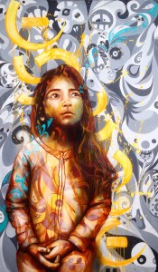 Acrylic and spray paint. This is a portrait of a 4 year old girl from a Salvadoran family that Joel has been close to since his first visit to El Salvador in 2004, an example of his canvas work.