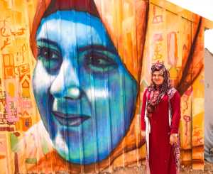 Dareen, a participant in an Azraq Camp project, poses in front of her portrait.