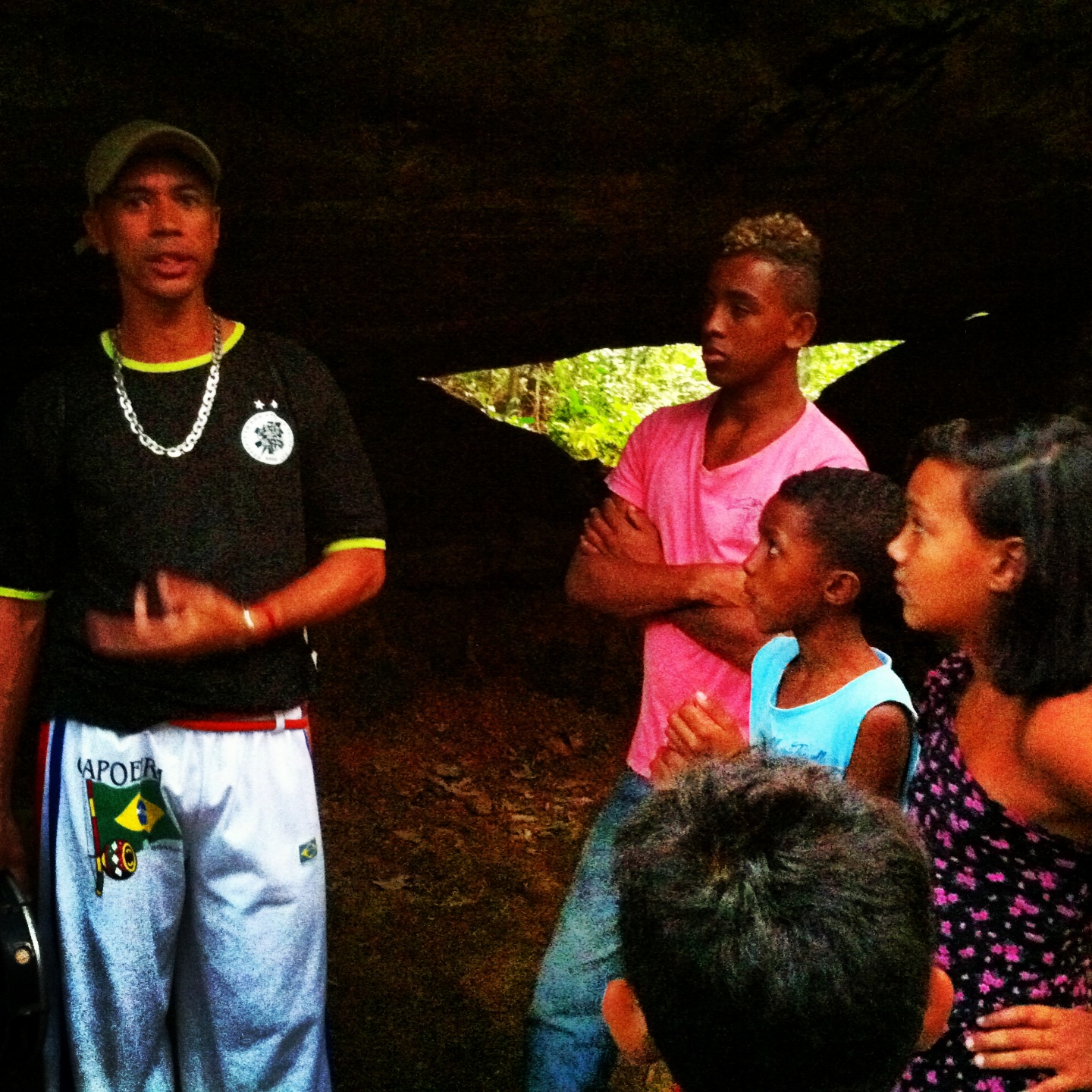 Edilson shows us where his ancestors, escaped slaves, lived under a huge rock centuries ago on a hill in Rio de Janeiro.