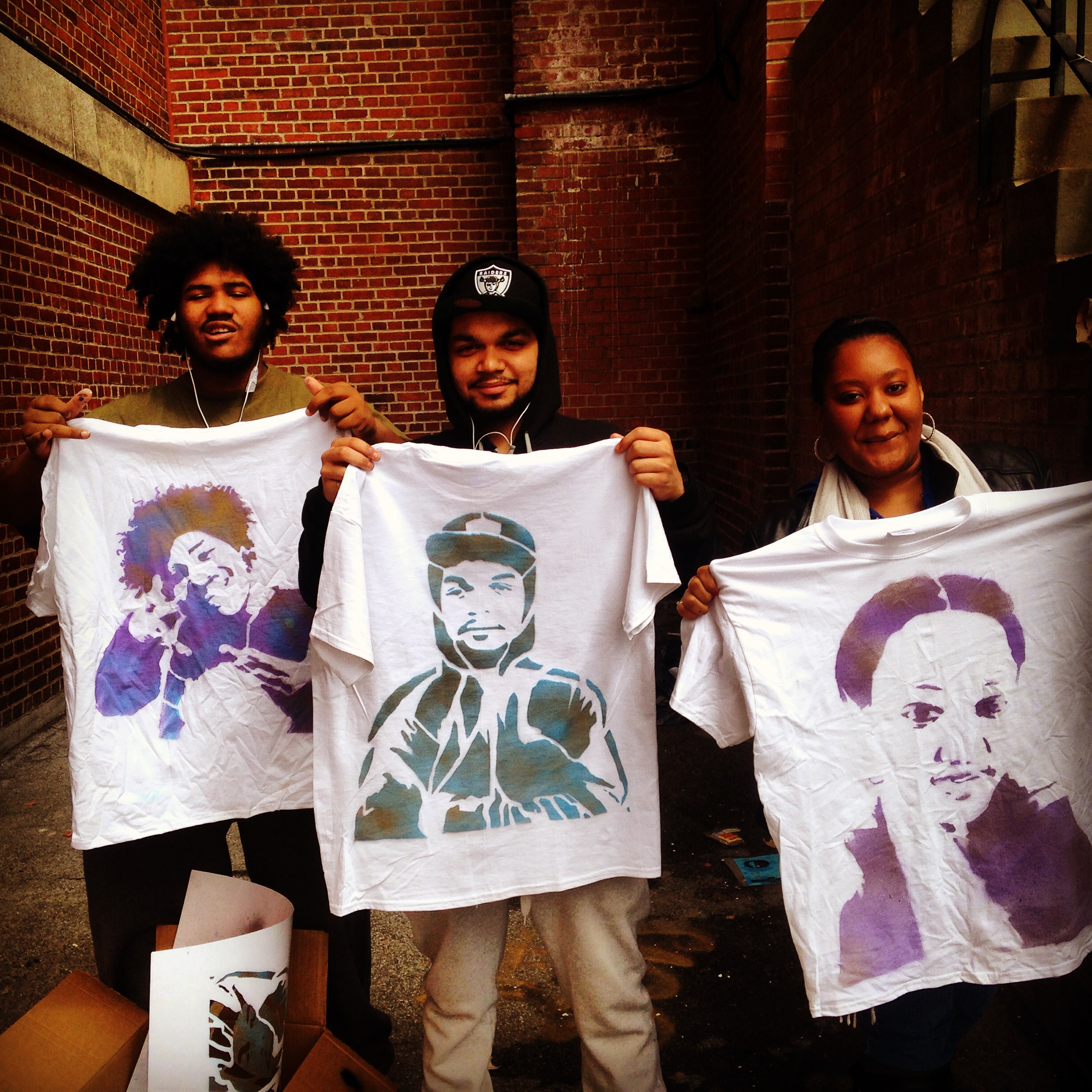 This year, I have been leading arts-based workshops with youth involved in the justice system. Through the organization Artistic Noise, I worked with teens in Brooklyn and Harlem who have recently been in trouble with the law, engaging them in creative activities and the life experience of creating art to be exhibited publicly. Together we had discussions and presentations, went on field trips, made stencils and collages, explored abstract expressionism, painted a mural, made custom T-shirts and learned painting and aerosol techniques. For one project in Brooklyn, the students created self portraits on canvas in which they spray painted their stencils over their own abstract backgrounds. In a second project, we had discussions about what positive achievement each of them would like to one day be known for. This was a question many had not previously considered, assuming that they could only be in the media for negative actions. They glued newspaper collages onto canvas, spray painted their own images on top and then created headlines that they dreamed they would one day see: achievements in the fields of medicine, sports, science and entertainment.