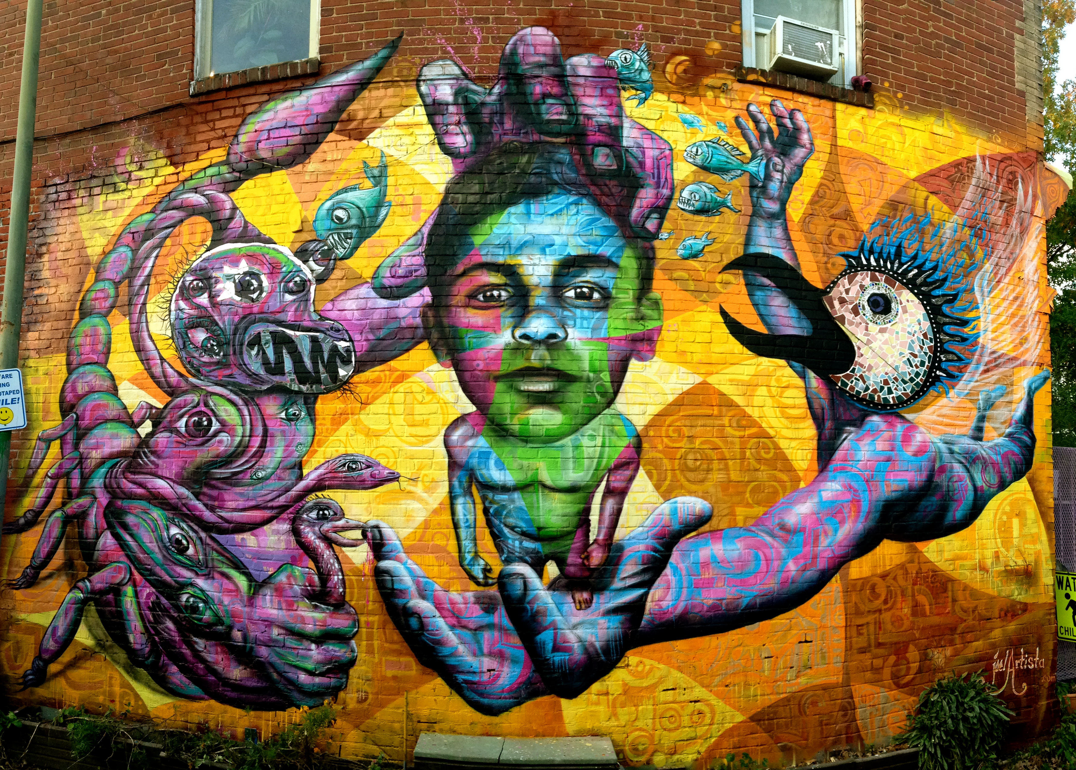 Washington DC and nearby Baltimore have been host to many of Joel’s projects, as DC was his home base for five years. In collaboration with institutions like the Latin American Youth Center, the Boys & Girls Center and Ballou High School, Joel has led many workshops and mural art projects with local youth. He also organized initiatives with vulnerable populations in the DC area who wished to tell their stories to the wider community through public art. They were interviewed by Joel and chose the imagery and content of the mural designs. The “Global Refugee Mural” gave three refugees from Iraq, Myanmar and the Democratic Republic of Congo the opportunity to share their experiences and educate the community about the important issues in their homelands. Joel partnered with the International Refugee Committee (IRC) on the project, which was featured on the global news network Al-Jazeera English. (Funded by the Montgomery County Council on the Arts.) “Currulao y Desplazamiento: The Afro-Colombian Mural” on DC’s busy U Street was designed in collaboration with seven of Joel’s friends in the Afro-Colombian community who have asylum in the US due to the armed conflict in the Pacific Coast region of Colombia. It aimed to celebrate their vibrant culture and educate the public about an important, but mostly invisible, human tragedy. (funded by the DC Commission on the Arts & Humanities) “A Survivor’s Journey: The Domestic Violence Awareness Mural” featured the participation of three local survivors of domestic violence who were being assisted by the organization DASH (District Alliance for Safe Housing). The artwork explored this issue in order to bring it to the public’s attention, and highlighted the inspiring stories of women who had overcome great obstacles in order to rebuild their lives. These three projects were inaugurated by large public events that featured musical and dance performances, refreshments and speeches by members of the groups who participated in the designs, who shared their experiences with the public. (funded through a Kickstarter campaign)